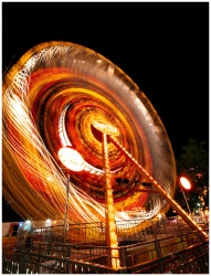 Vibrant long-exposure photo of an illuminated carousel spinning at night in an amusement park.