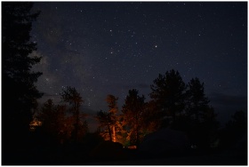 A picturesque starry night sky over a forest with tree silhouettes and a warm campfire glow.