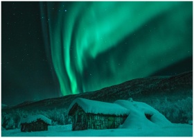Captivating view of Northern Lights illuminating snowy cabins and wintry night sky in Norway.