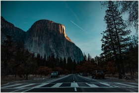 A scenic highway view with cars leading to the iconic El Capitan in Yosemite National Park at sunset.