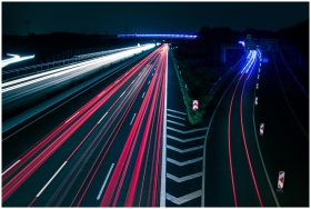 Long exposure photo of highway light trails creating dynamic motion at night.