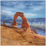 Delicate Arch in Moab, Utah, showcased against a winter landscape. Perfect for travel and nature enthusiasts.