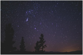 A serene night sky with visible constellations and silhouetted trees under a clear starry sky.