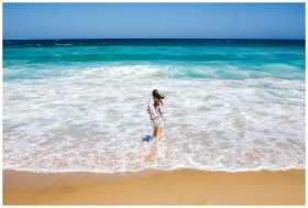A woman stands on a sandy beach, gazing at the turquoise ocean under a clear blue sky.