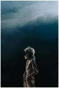 Person in astronaut suit and helmet against a cloudy sky backdrop.