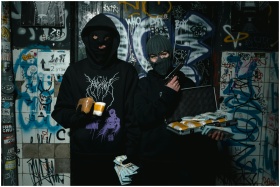 Two masked individuals holding cash, gun, and briefcase in a graffiti-covered alley.