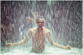 A delighted man enjoys the invigorating flow of wa