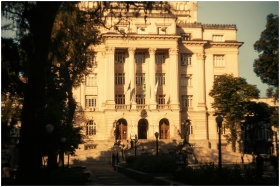 Elegant historic building facade illuminated by warm sunlight, featuring columns and flags.