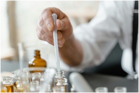 Detailed image of a person mixing essential oils in a laboratory setting.
