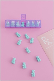 Colorful weekly pill organizer with blue pills scattered on a pink background, emphasizing medication routine.