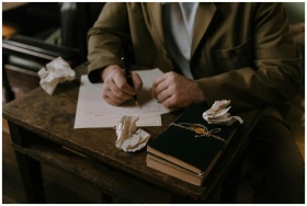 A person writing at a wooden desk with crumpled papers and a book.