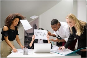 Team of stressed colleagues in an office dealing with paperwork chaos, asking for help.