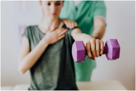Crop unrecognizable orthopedist in uniform helping slender female in casual wear reaching arm with dumbbell in doctor office in hospital