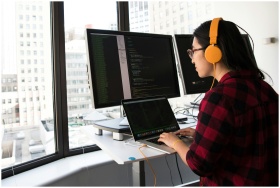 Woman programming on a laptop at a standing desk in an office with large windows.
