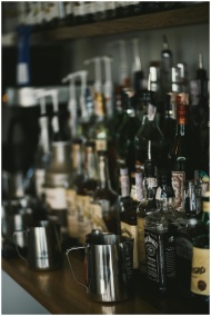 Assorted liquor bottles and glasses in a dimly lit