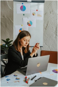 Businesswoman reviewing charts at a laptop in an office setting with presentations behind her.