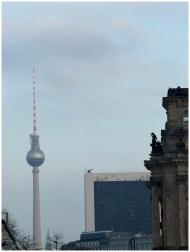 View of Berlin TV Tower and Reichstag Building in winter sky.