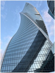 Stunning architectural shot of the iconic twisting skyscraper against a clear blue sky in Moscow.
