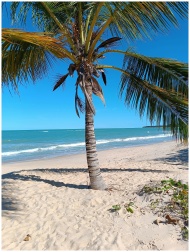 Peaceful tropical beach scene with a palm tree under a clear blue sky.