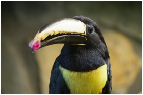 A vibrant toucan perched with its colorful beak and feathers on display.