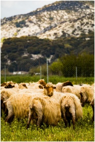 A flock of sheep grazing peacefully on a hillside pasture in Crete, Greece.
