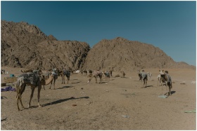 A herd of camels stands in a vast desert with moun
