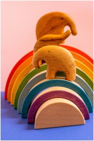 Vibrant wooden elephant figurines arranged in a rainbow arc, perfect for creative play setups.