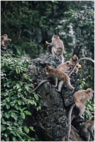 Capture of monkeys gathering on rocky terrain in a lush jungle setting, suggesting wildlife and natural habitat.
