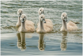 Five young swan cygnets swimming together on a peaceful lake with reflections.