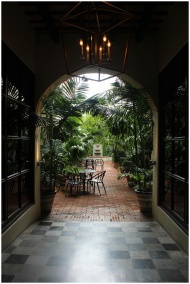 Serene outdoor patio surrounded by tropical plants in San Juan, Puerto Rico.