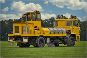 A yellow commercial vehicle parked on a grassy fie