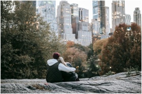 Couple enjoying a tender moment on a rocky outcrop with a cityscape backdrop during fall.