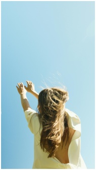 A woman reaching up towards the blue sky, wearing a backless white dress with the wind blowing her hair.