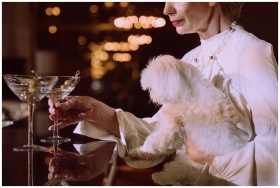 Sophisticated woman holding a white dog while enjoying cocktails at a classy bar setting.