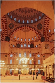 A stunning view of an ornate mosque interior with