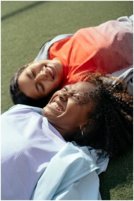 High angle of cheerful multiracial girlfriends lying on green lawn and toothy smiling while having fun together