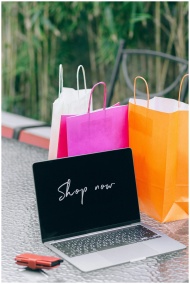 Laptop displaying 'Shop now' with vibrant shopping