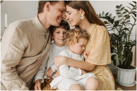 A loving family of four shares a tender moment in a cozy indoor setting, embracing and smiling.