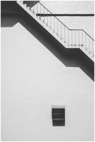 Black and white photo of a modern building's exterior staircase with strong shadows.