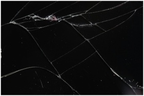 Close-up of a cracked glass surface displaying intricate patterns and reflections.