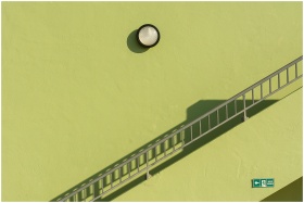 A green wall with a modern lamp and railing create