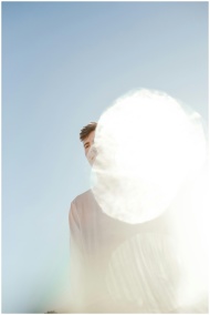 A creative portrait of a young man with lens flare against a bright blue sky background.