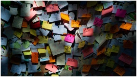 Various colorful sticky notes pinned on a board creating a vibrant display.