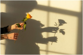 A hand holding a yellow rose against a wall, casti