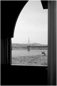 Black and white view of a bridge with a boat passing under, framed by an archway in Istanbul.