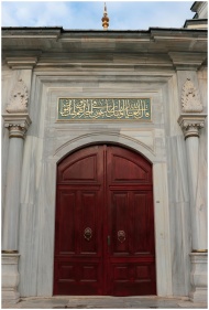 Beautiful mosque entrance with ornate red doors and Arabic calligraphy sign above.