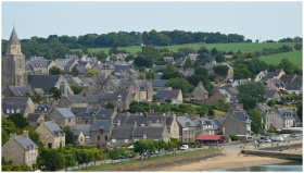 Picturesque view of Saint-Suliac village with historic architecture and lush greenery.