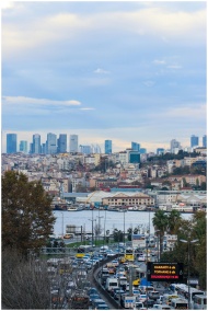 A vibrant cityscape of Istanbul showcasing a mix of modern skyline and historical architecture with traffic in the foreground.