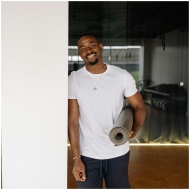 Young man in a white shirt smiling and holding a yoga mat indoors.