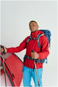 Portrait of a hiker in a red jacket with tent and